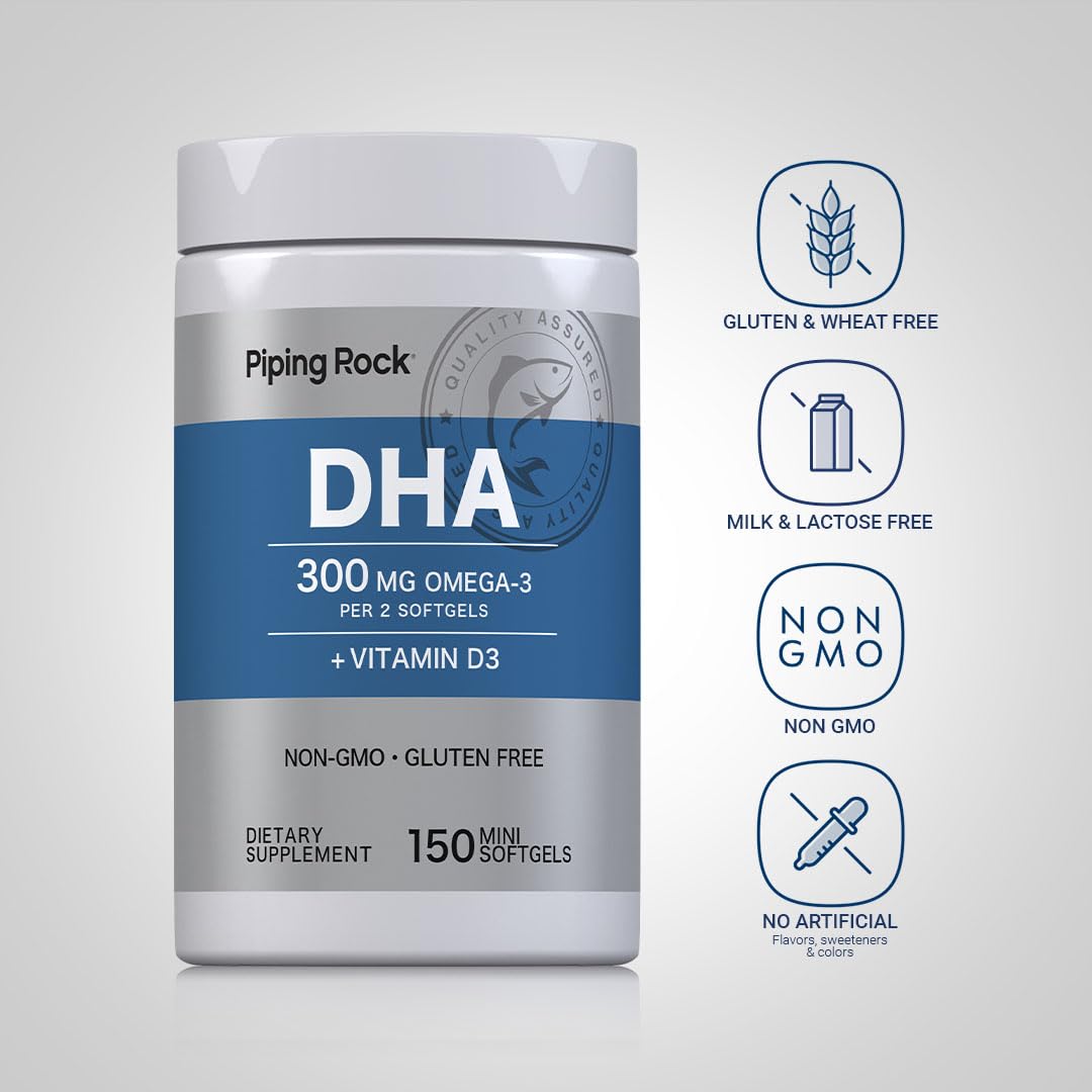 Piping Rock DHA | 150 Mini Softgels | 300mg Omega-3 + Vitamin D3 | Non-GMO, Gluten Free Supplement