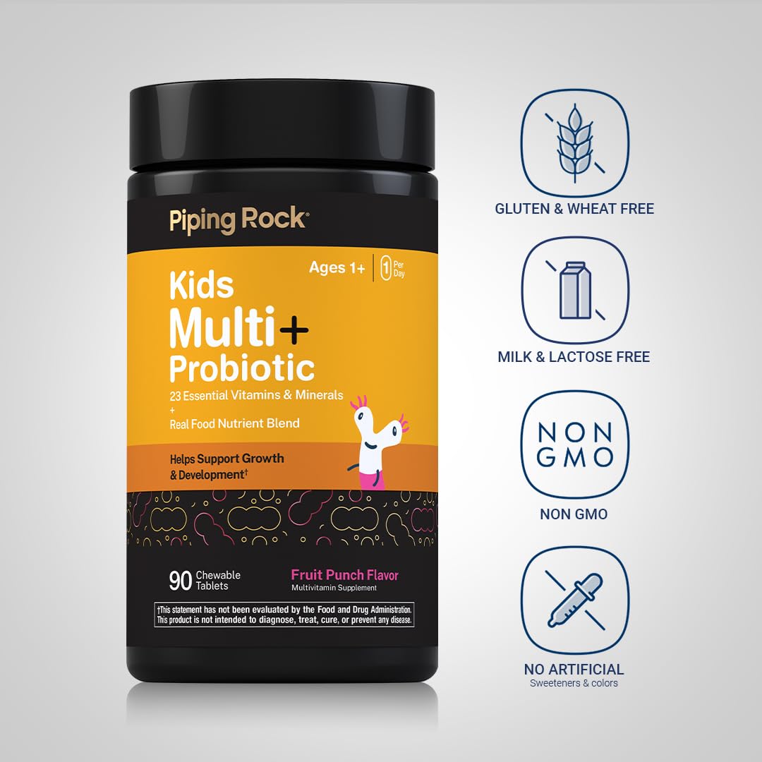 Piping Rock Kids Multivitamin + Probiotic | 90 Chewable Tablets | Fruit Punch Flavor | with 23 Essential Vitamins & Minerals | Vegetarian, Non-GMO and Gluten Free—