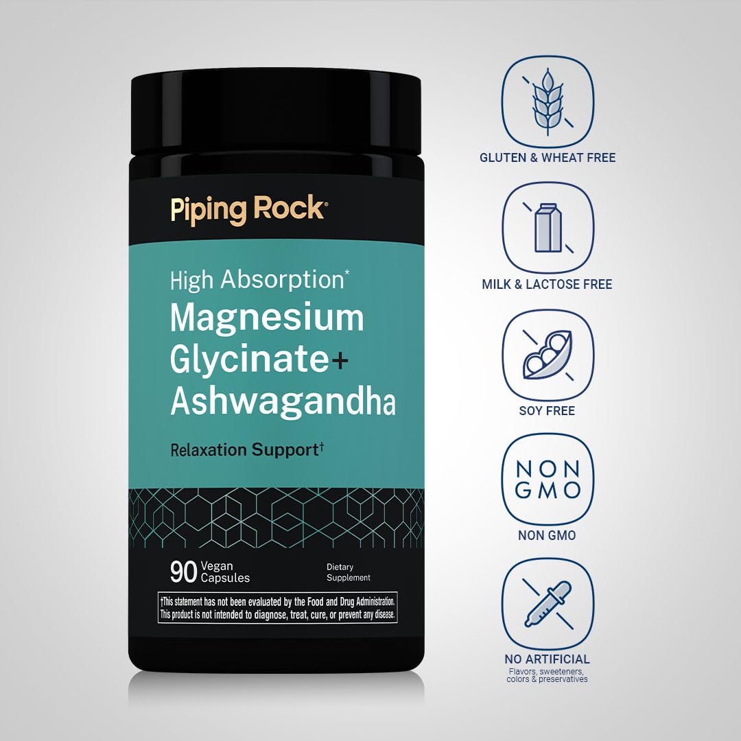 Piping Rock Magnesium Glycinate & Ashwagandha Complex Supplement | 90 Vegan Capsules | High Absorption Pills | Non-GMO, Gluten Free