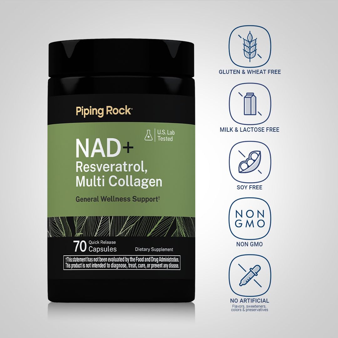Piping Rock NAD Resveratrol Supplement | Plus Collagen | 70 Capsules | Non-GMO, Gluten Free—