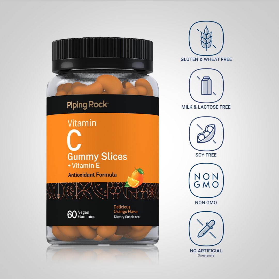 Piping Rock Vitamin C Gummies | 60 Count | Orange Flavor | with Vitamin E | Vegan, Non-GMO, and Gluten Free Supplement